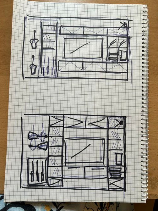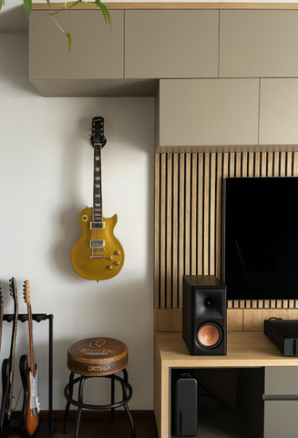 A lebegő hatású alsó szekrénysor rejtett teherhordó lábakkal biztosítja a stabilitást, miközben vizuálisan könnyed marad. A mennyezetig futó beépítés, a lamellás háttérpanel és az átgondolt anyaghasználat egységes, időtálló megjelenést ad. Rejtett kábelvezetés, jövőbiztos kialakítás és személyes részletek - tárolás és design egy rendszerben.